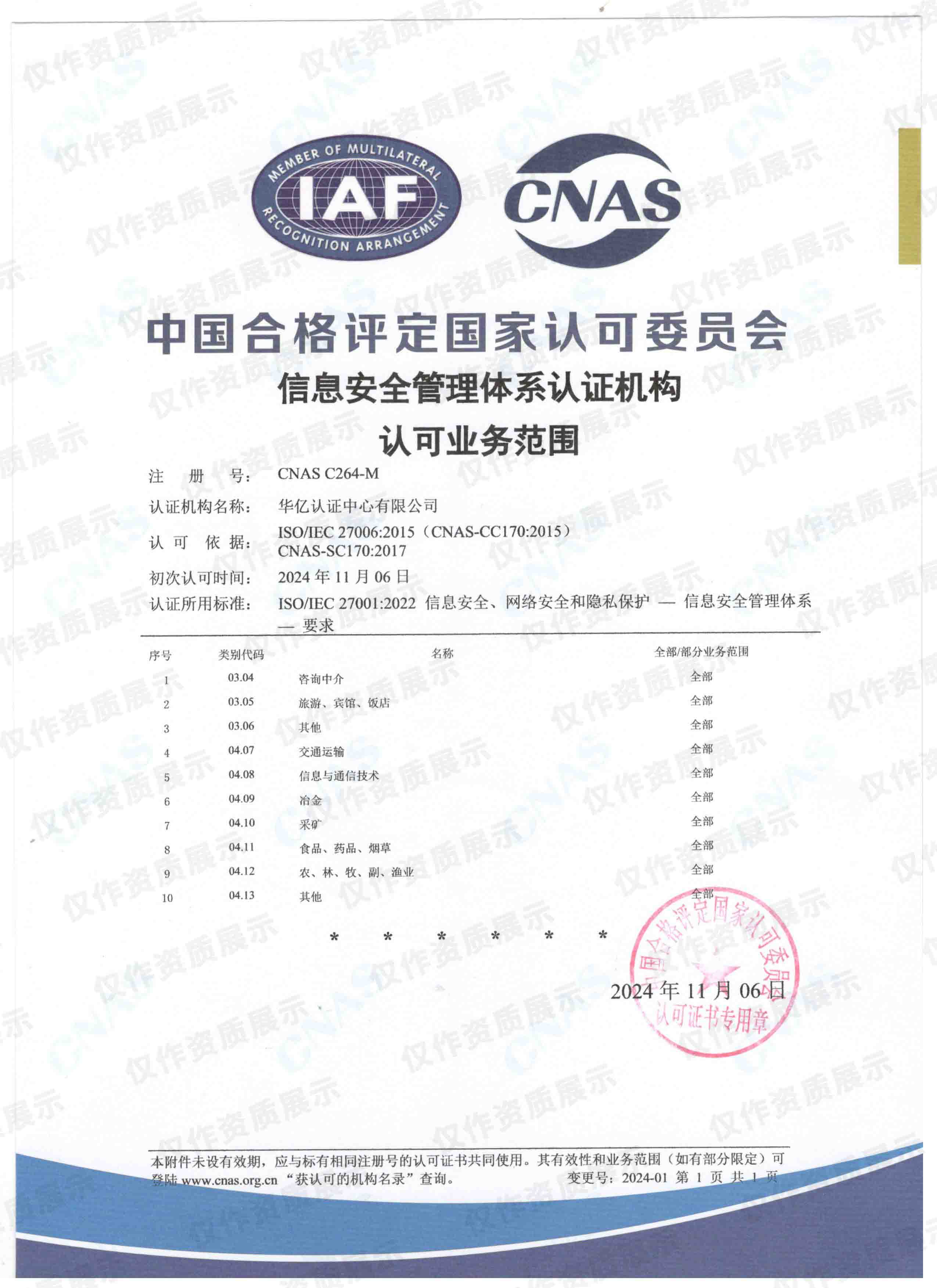 CNAS信息安全管理体系认证机构认可业务范围