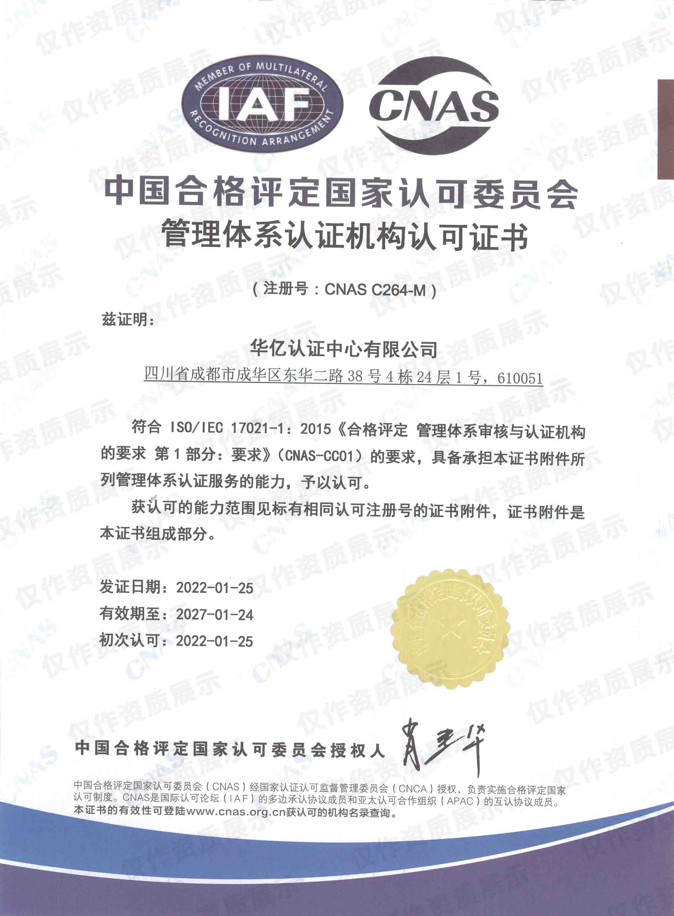 管理体系认证机构认可证书