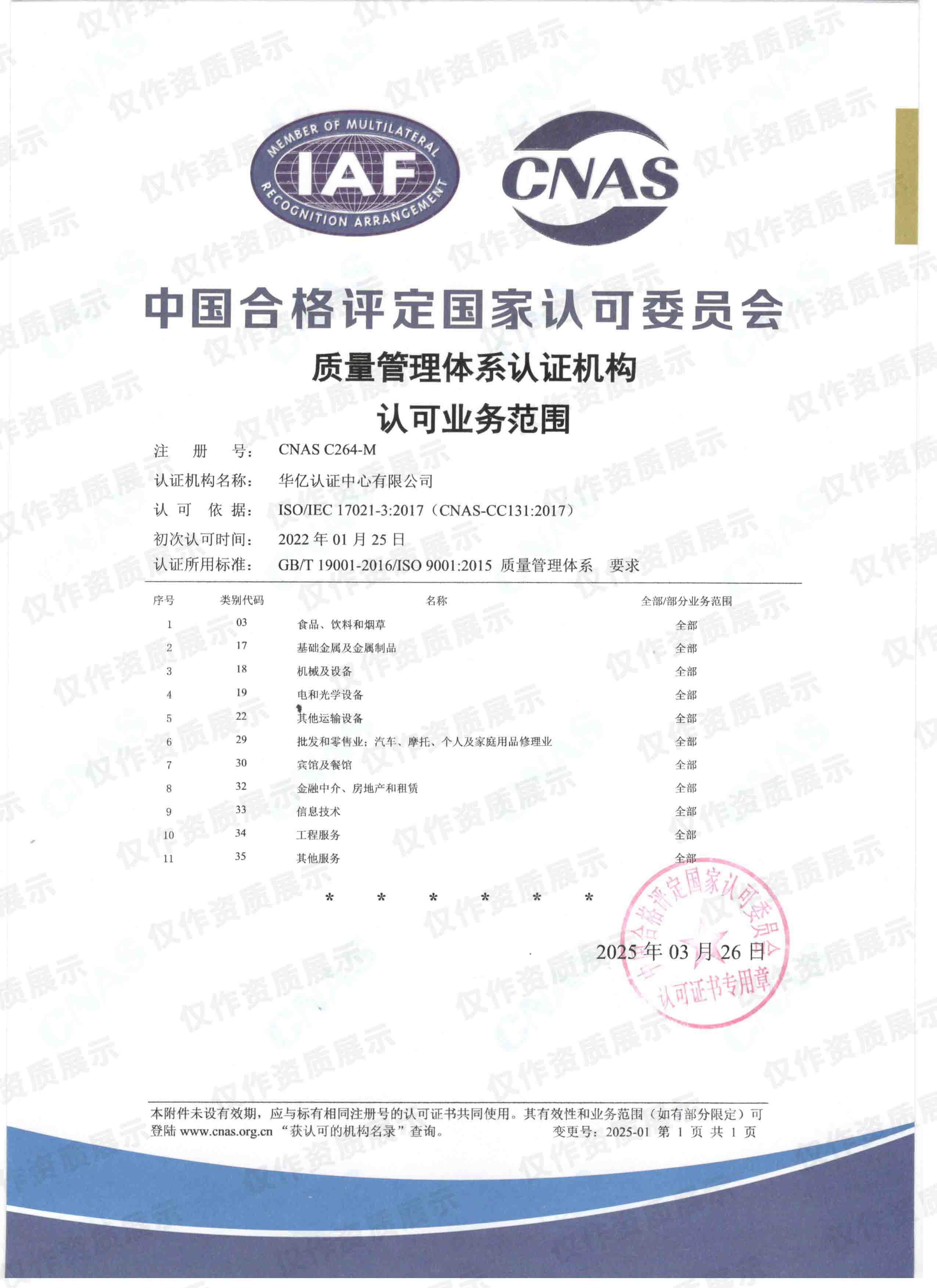 CNAS质量管理体系认证机构认可业务范围