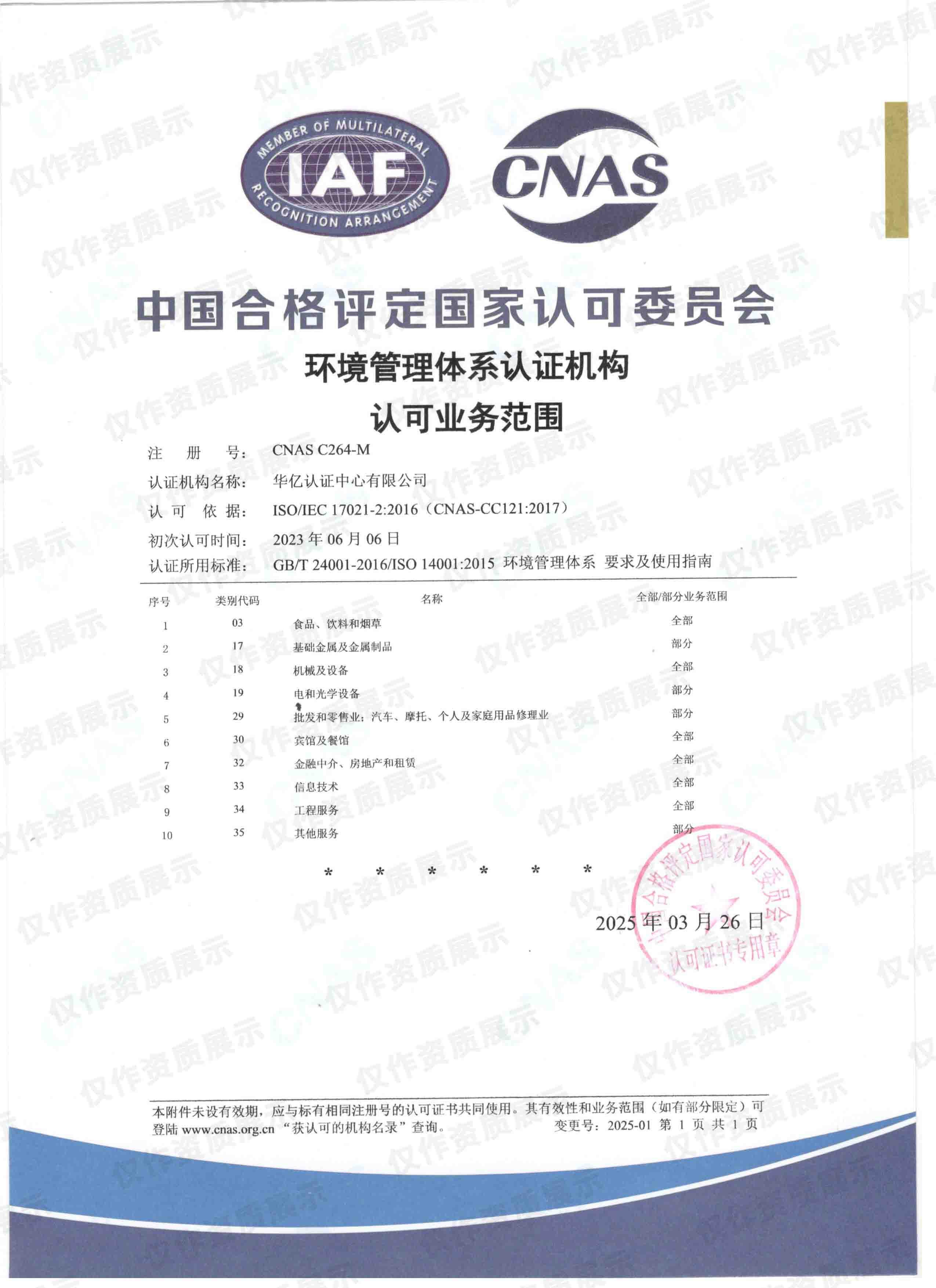 CNAS环境管理体系认证机构认可业务范围