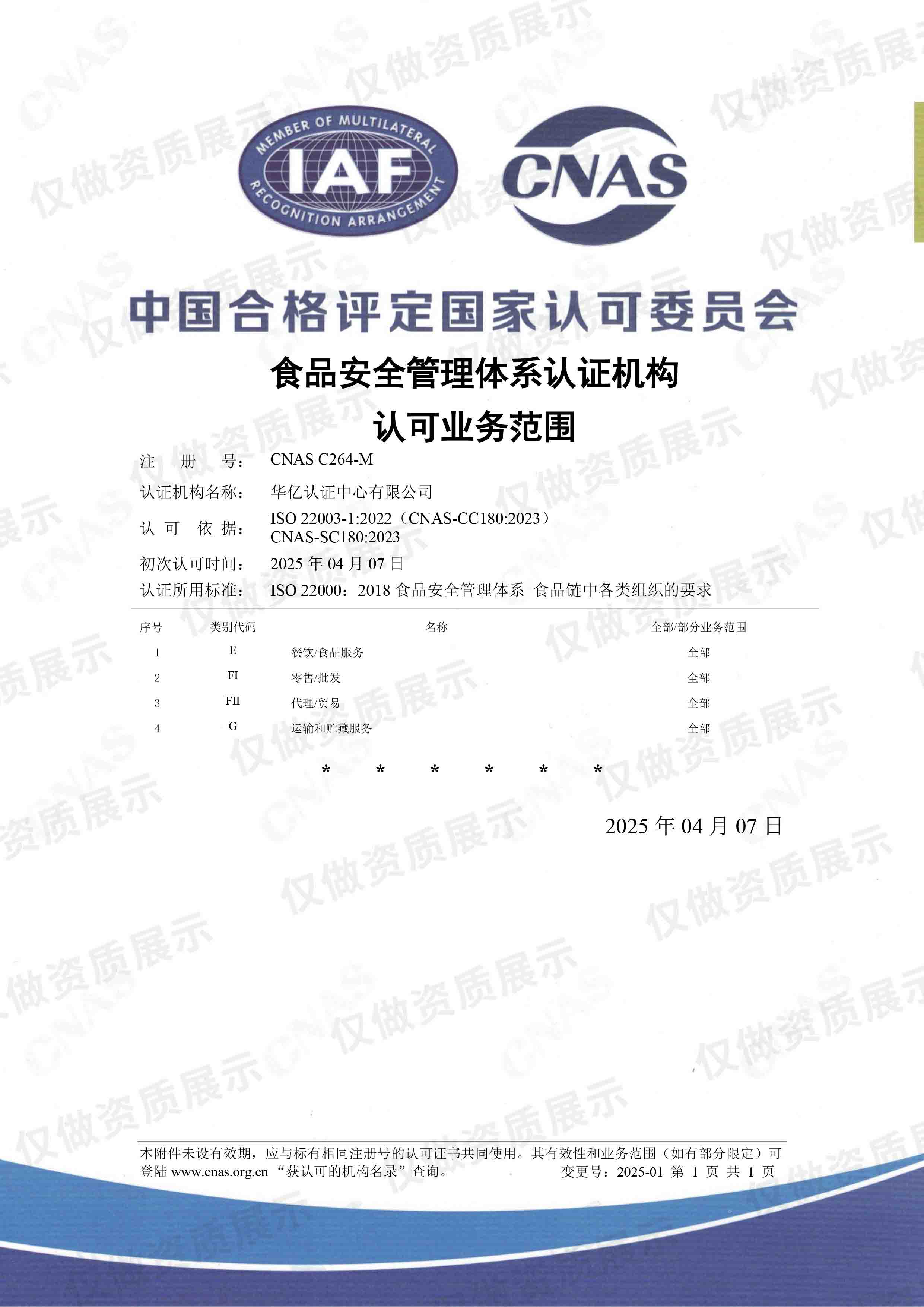 CNAS食品安全管理体系认证机构认可业务范围