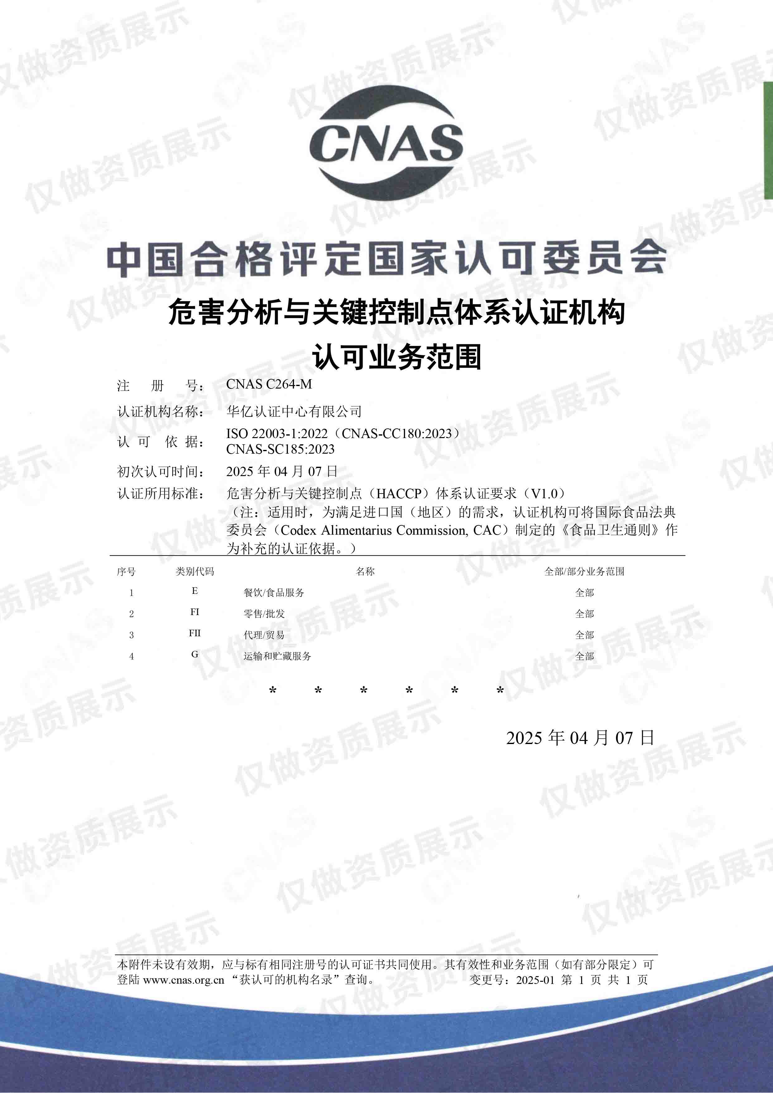 CNAS危害分析与关键控制点体系认证机构认可业务范围